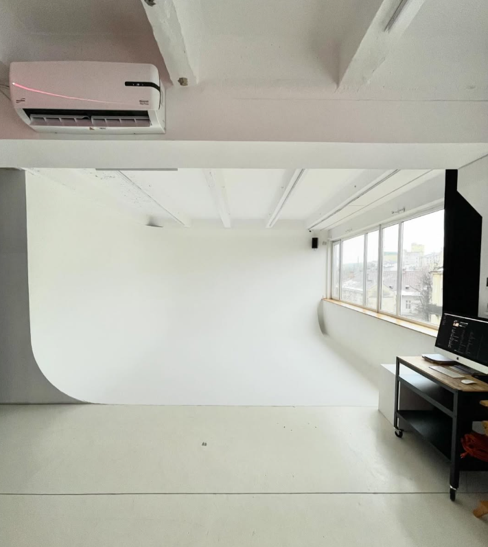 🎬 Основна фішка простору — велика циклорама 4×5 м, яка дозволяє знімати чистий комерційний контент: від каталогів до рекламних кампаній. Вона ідеально підходить для брендів, які працюють із продуктом і потребують універсального фону.